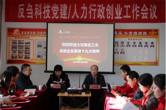 11月17日,旗总工会在优然牧业举办了“草原儿女心向党,共圆伟大中国梦”诗歌朗诵会。11月28日,旗总工会负责人深入北方稀土生一伦高科技有限公司、内蒙古(大北农)四季春饲料有限公司、环卫工人爱心驿站宣讲党的十九大精神。在宣讲活动中,旗总工会要求各企业工会把学习宣传贯彻落实十九大精神作为当前和今后一个时期的头等大事来抓,把十九大精神贯穿到工会各项工作中,团结动员企业职工立足本职、爱岗敬业,为土左旗经济社会发展贡献力量。