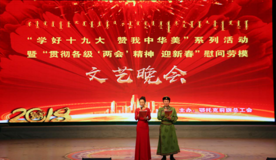 为贯彻落实好党的十九大和自治区、鄂尔多斯市、鄂托克前旗“两会”精神,丰富全旗职工文化生活,集中展示劳模和当代工人追求时尚、清新活泼、锐意进取、勇于创新的时代风采,1月31日,鄂托克前旗总工会举办“学好十九大·赞我中华美”系列活动暨“贯彻各级‘两会’精神·迎新春”慰问劳模文艺晚会。旗政协副主席图娅等领导同全旗800余名各级劳模和部分职工代表一道观看了晚会。