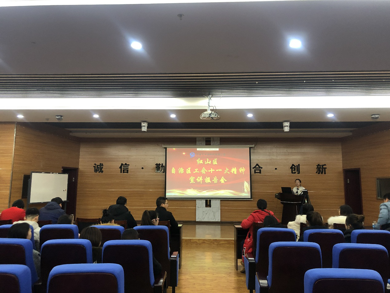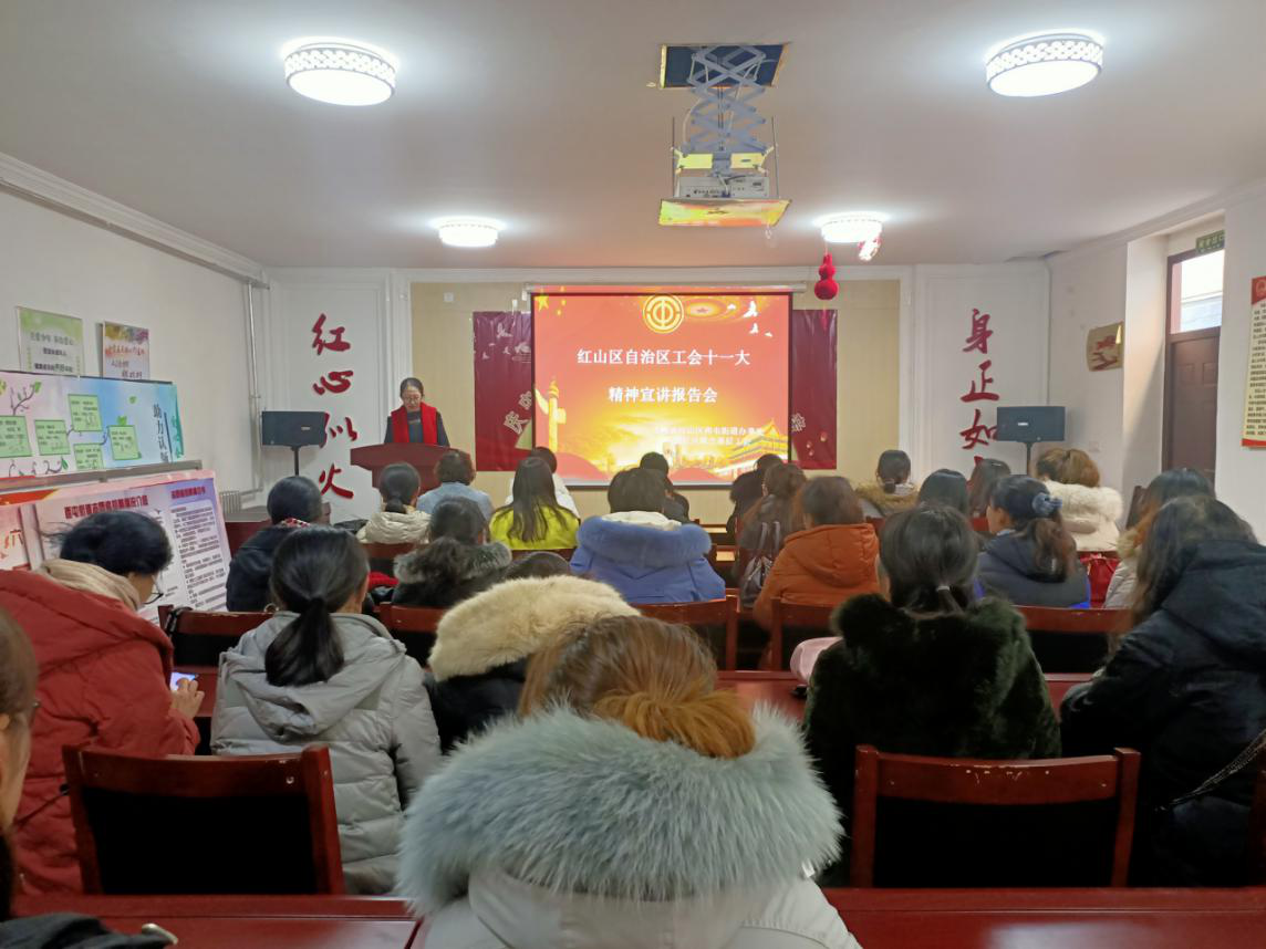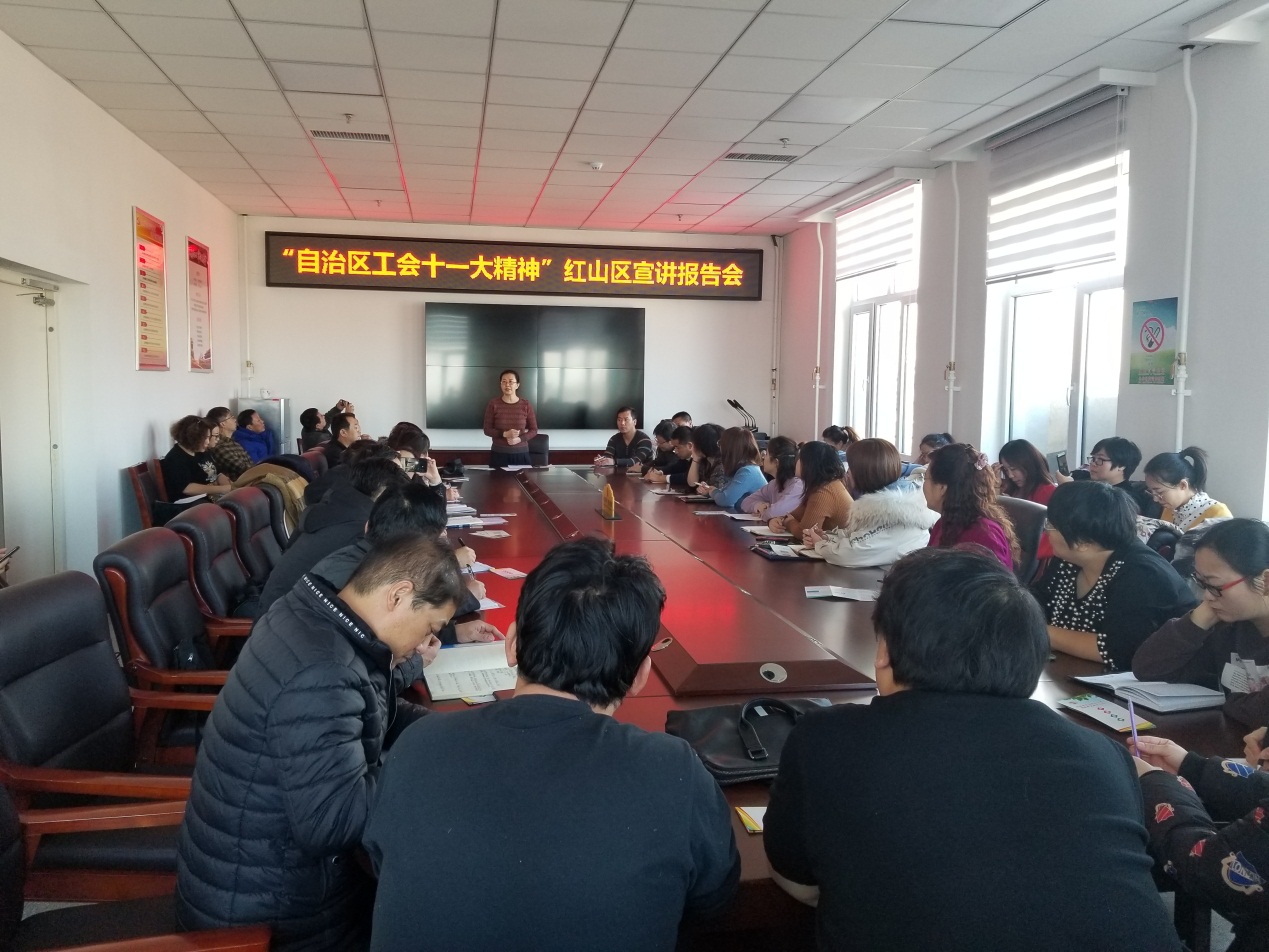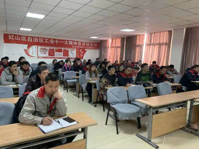 为在各级工会中掀起学习宣传贯彻落实自治区工会十一大精神热潮,11月26日至12月5日,赤峰市红山区总工会组织区总党组成员和红山区7名自治区工会十一大代表组成自治区工会十一大精神红山区宣讲团分赴红山区各镇街、园区、系统工会和远联钢铁、格林特等部分企业工会进行宣讲,历时一周多时间,共举行宣讲报告会21场,800余名干部职工聆听了宣讲。