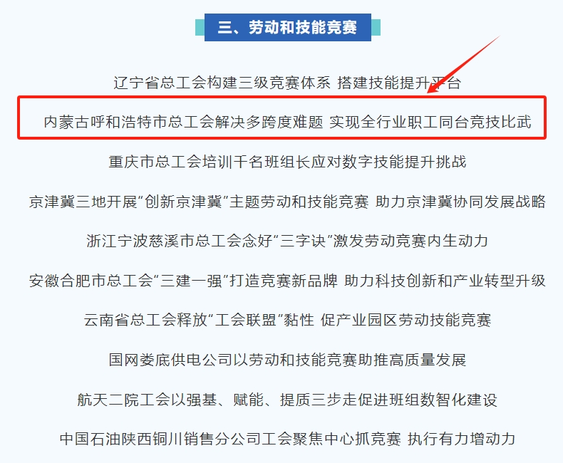 内蒙古呼和浩特市总工会探索创新解决跨电网、跨集团隶属、跨企业、跨技术标准“四跨”难题,成功举办全市火力发电行业职工职业技能比赛,在全行业形成“以赛促学练兵、同台竞技比武”的良好氛围,为拓展更具特色、更广范围的职工职业技能比赛提供了组织模板和赛道指引。