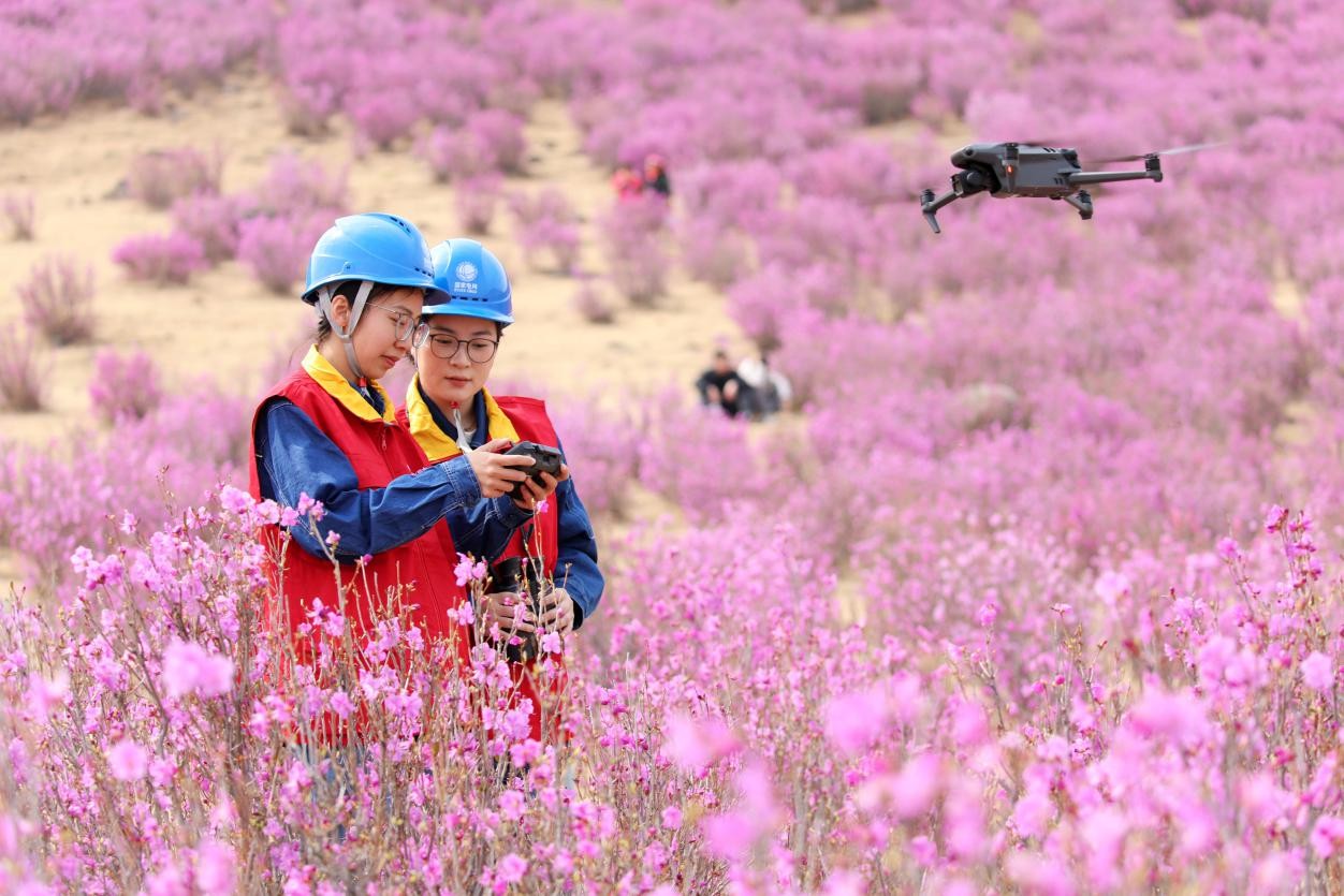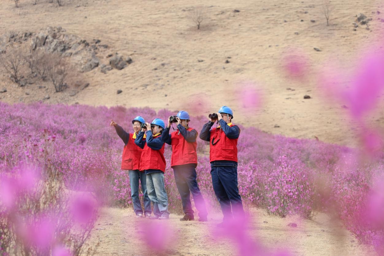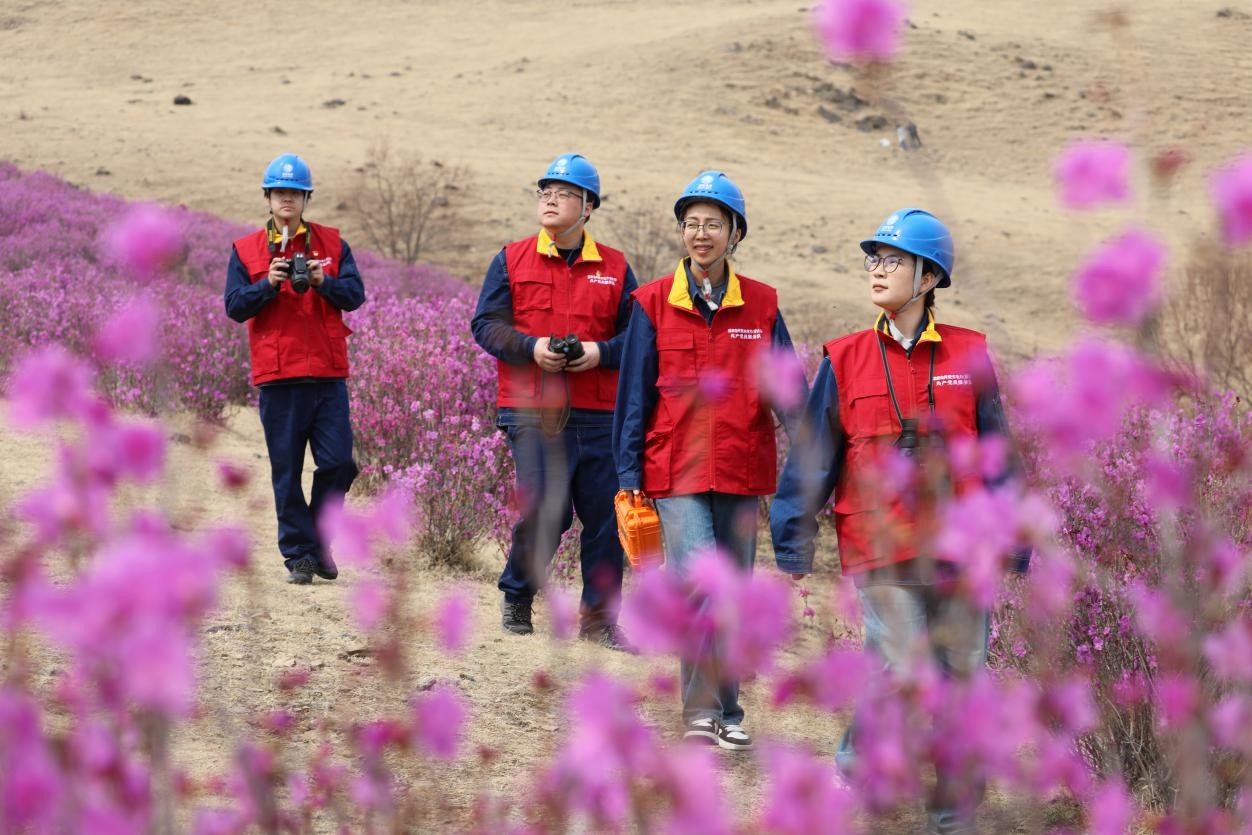 4月28日,在内蒙古自治区扎兰屯市中和镇架子山村杜鹃坡,国网扎兰屯输变电工区志愿者对电力线路进行巡检。