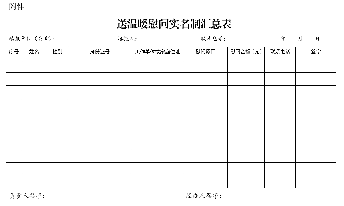 (一)送温暖走访慰问职工款物要坚持实名制发放,实名制汇总表应包括慰问对象的姓名、身份证号、工作单位、联系方式、慰问原因、慰问金额(物品可折合成金额登记并标注)、本人签字、负责人签字、经办人签字等有关信息(格式见附件)。资金使用情况须在资金发放之后30日内录入全国工会帮扶工作管理系统送温暖管理模块备查。